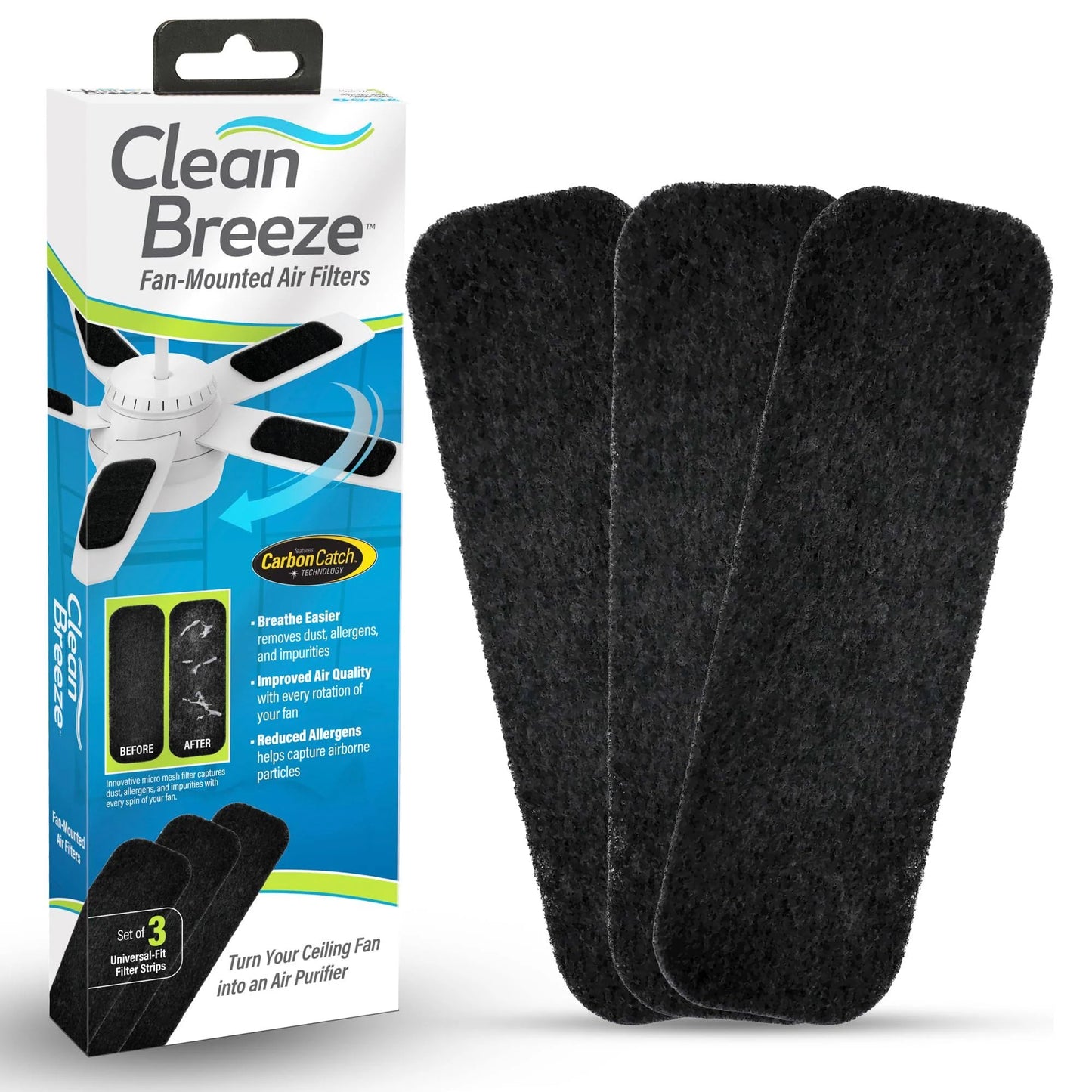 Upgrade your home’s air quality effortlessly with CLEAN BREEZE Ceiling Fan Filters, designed to improve indoor air circulation and help reduce dust, allergens, and airborne particles. These universal-fit fan blade filters attach directly to your ceiling fan blades, transforming your fan into a silent air purifier with every spin.